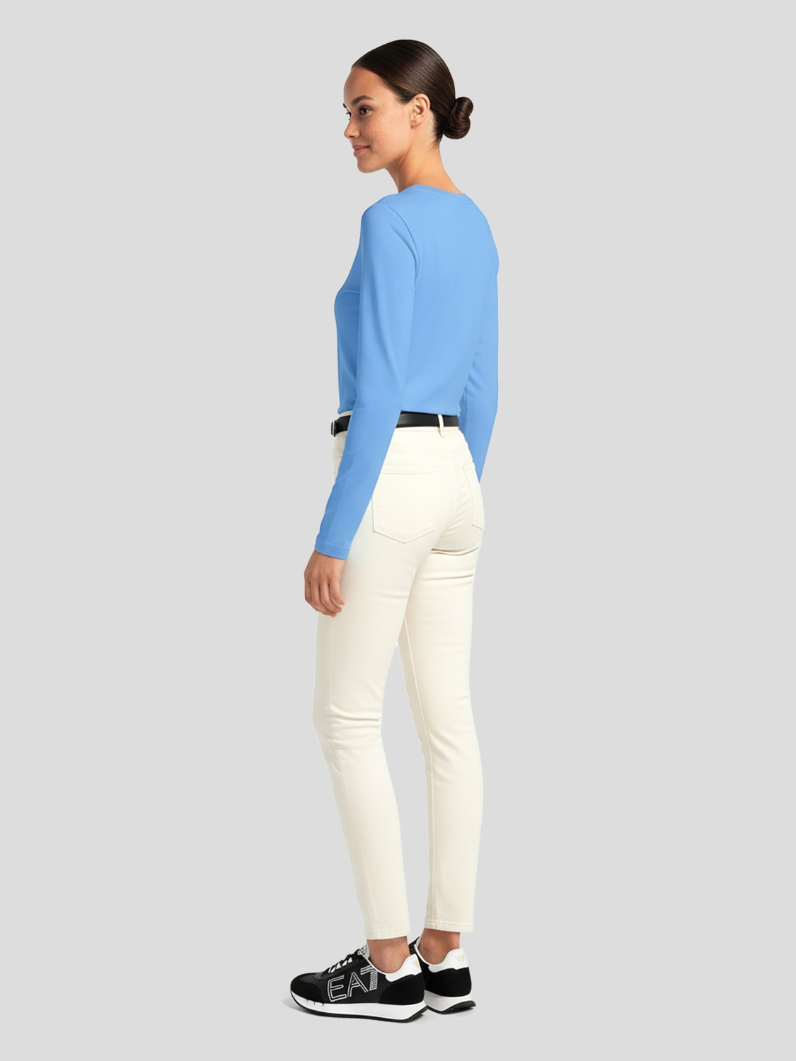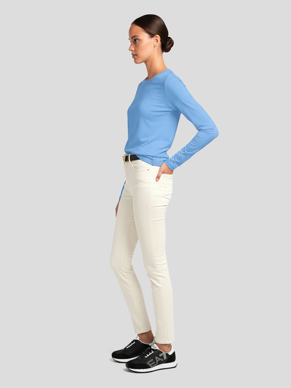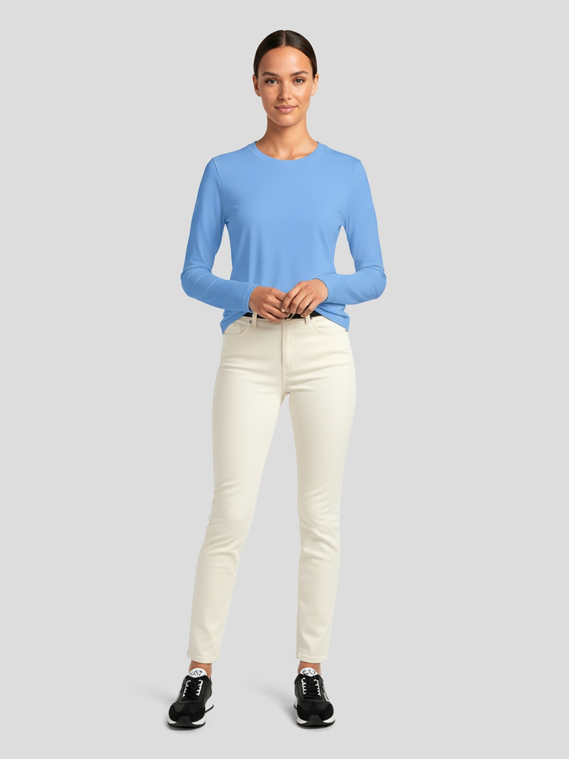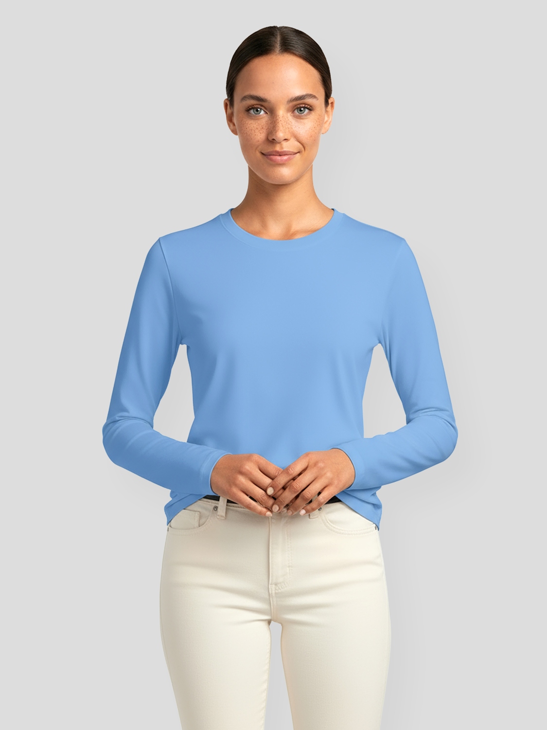 Уютный базовый женский лонгслив сшитый из высококачественного хлопкового материала качества Пенье. Лонгслив сохраняет свою форму даже после многократных стирок, на материала не образовываются катышки. Крой приталенный, вырез горловины О-образный, сама горловина выполнена из основного материала лонгслива, цвет голубой.