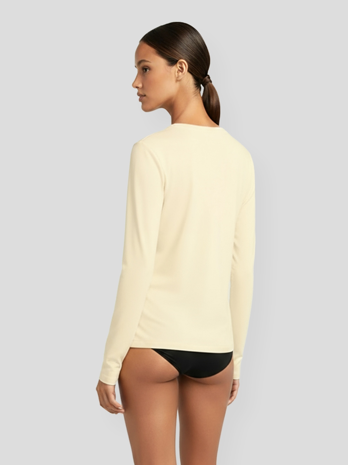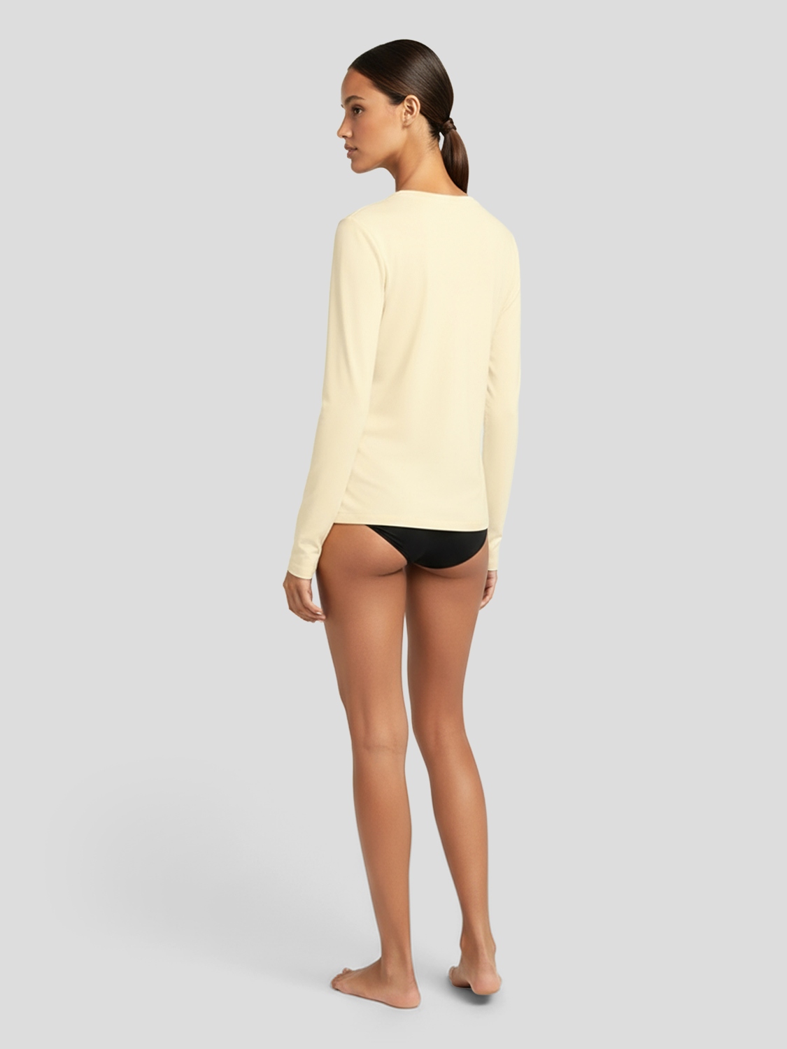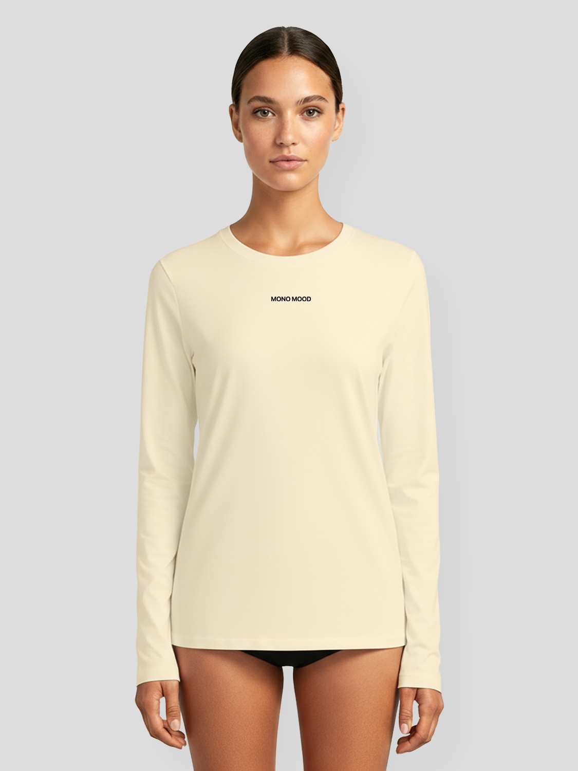 Уютный базовый женский лонгслив сшитый из высококачественного хлопкового материала качества Пенье. Лонгслив сохраняет свою форму даже после многократных стирок, на материала не образовываются катышки. Крой приталенный, вырез горловины О-образный, сама горловина выполнена из основного материала лонгслива, цвет ванильный. В верхней части, по центру расположен объёмный логотип MONO MOOD.