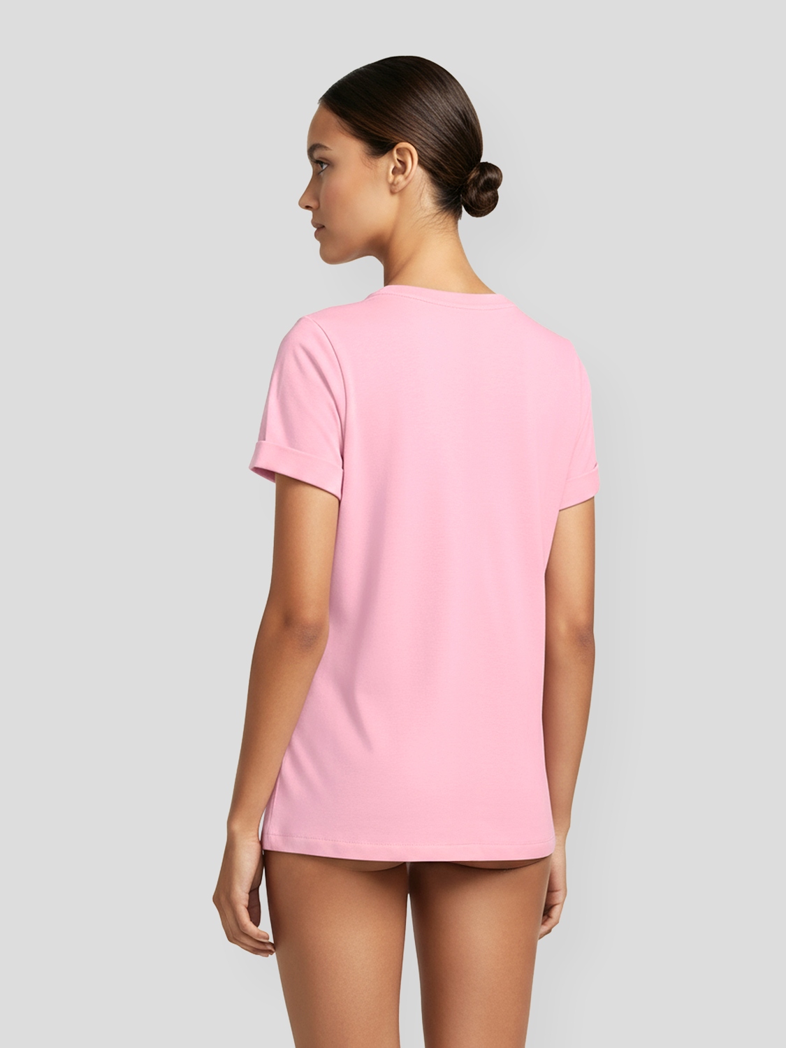 Базовая женская футболка с отворотами на рукавах, цвет розовый. Сшита из высококачественного хлопкового материала качества Пенье. Футболка сохраняет свою форму даже после многократных стирок, на материала не образовываются катышки. Крой прямой, свободный. О-образный вырез горловины, сама горловина выполнена из основного материала футболки. В верхней части груди расположен объёмный логотип MONO MOOD.