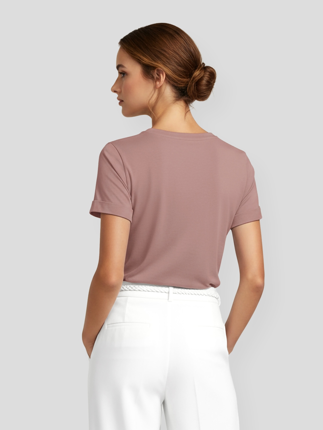 Базовая женская футболка с отворотами на рукавах, цвет пудровый. Сшита из высококачественного хлопкового материала качества Пенье. Футболка сохраняет свою форму даже после многократных стирок, на материала не образовываются катышки. Крой прямой, свободный. О-образный вырез горловины, сама горловина выполнена из основного материала футболки. В верхней части груди расположен объёмный логотип MONO MOOD.