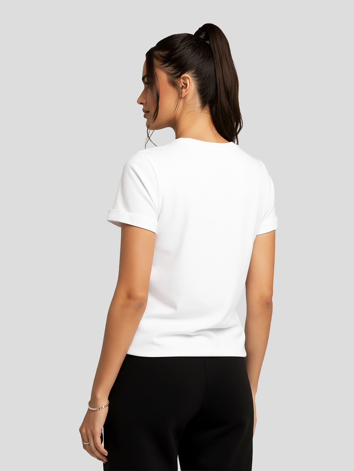 Базовая женская футболка с отворотами на рукавах, цвет белый. Сшита из высококачественного хлопкового материала качества Пенье. Футболка сохраняет свою форму даже после многократных стирок, на материала не образовываются катышки. Крой прямой, свободный. О-образный вырез горловины, сама горловина выполнена из основного материала футболки. В верхней части груди расположен объёмный логотип MONO MOOD.