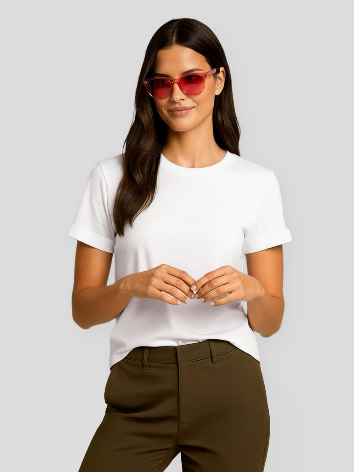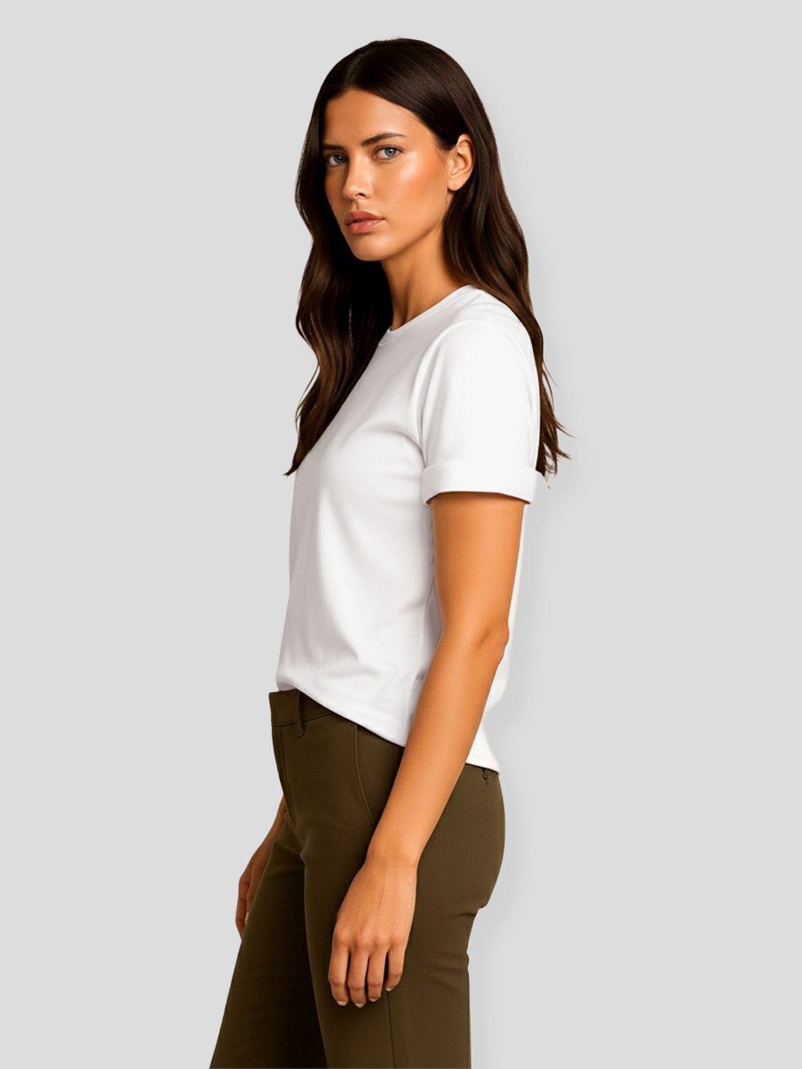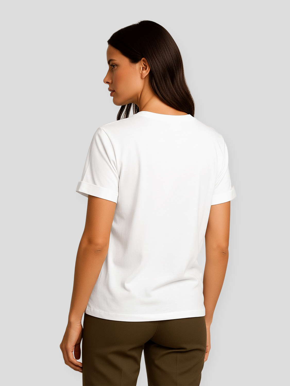 Базовая женская футболка с отворотами на рукавах, цвет белый. Сшита из высококачественного хлопкового материала качества Пенье. Футболка сохраняет свою форму даже после многократных стирок, на материала не образовываются катышки. Крой прямой, свободный. О-образный вырез горловины, сама горловина выполнена из основного материала футболки.