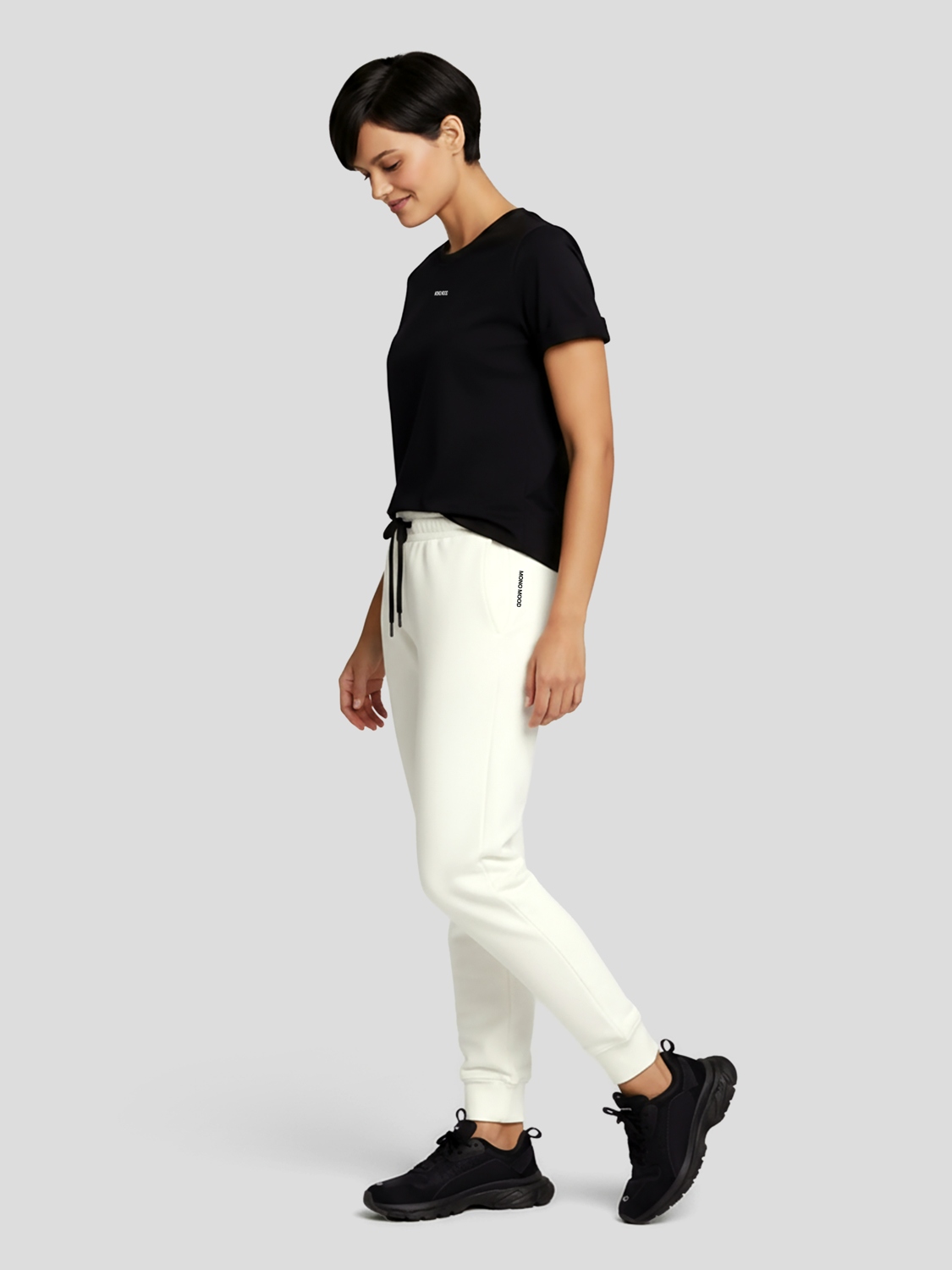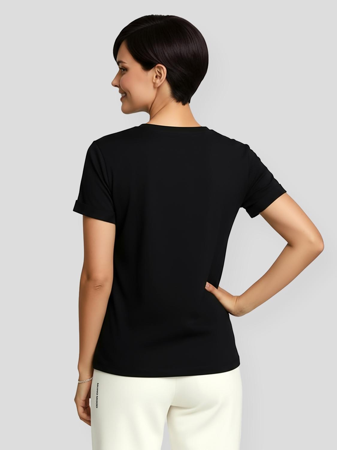 Базовая женская футболка с отворотами на рукавах, цвет чёрный. Сшита из высококачественного хлопкового материала качества Пенье. Футболка сохраняет свою форму даже после многократных стирок, на материала не образовываются катышки. Крой прямой, свободный. О-образный вырез горловины, сама горловина выполнена из основного материала футболки. В верхней части груди расположен объёмный логотип MONO MOOD.