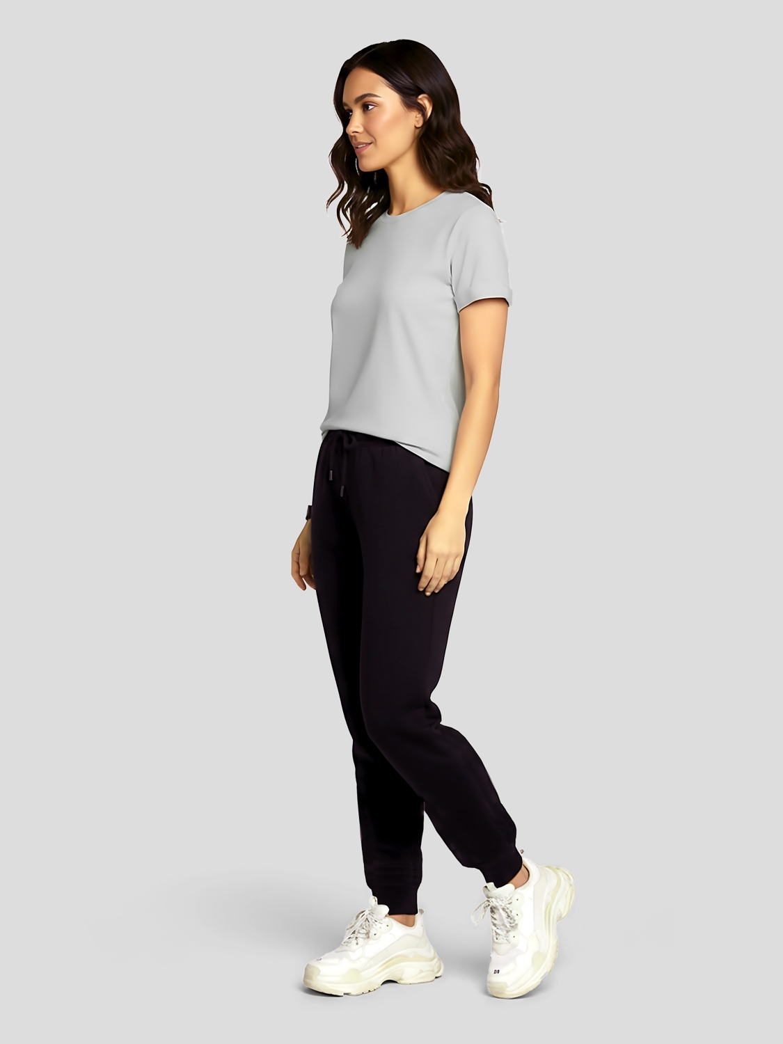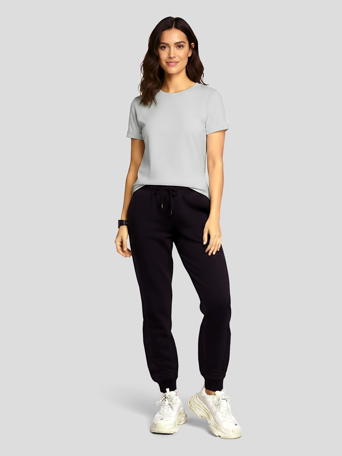 Базовая женская футболка с отворотами на рукавах, цвет серый. Сшита из высококачественного хлопкового материала качества Пенье. Футболка сохраняет свою форму даже после многократных стирок, на материала не образовываются катышки. Крой прямой, свободный. О-образный вырез горловины, сама горловина выполнена из основного материала футболки.