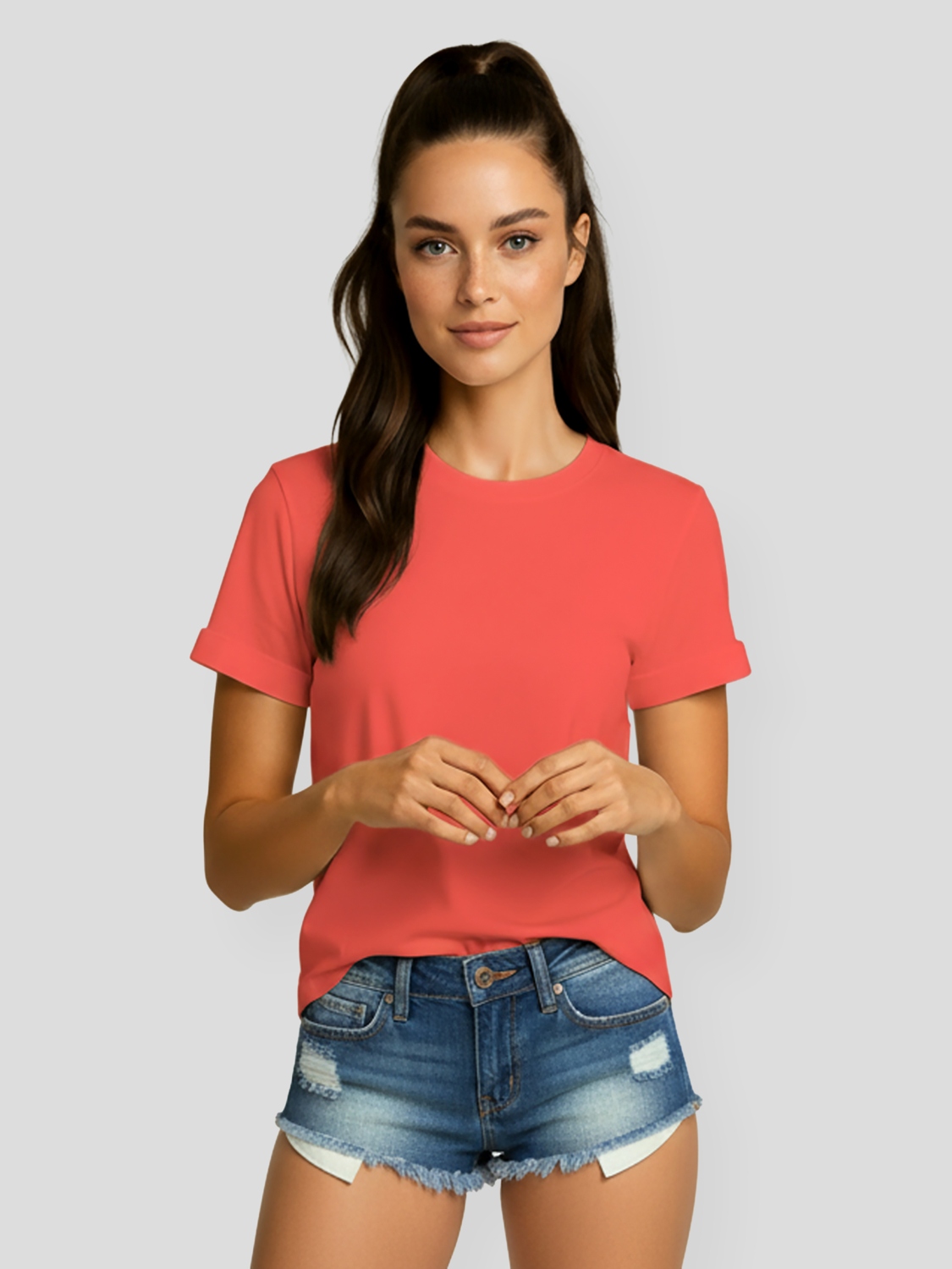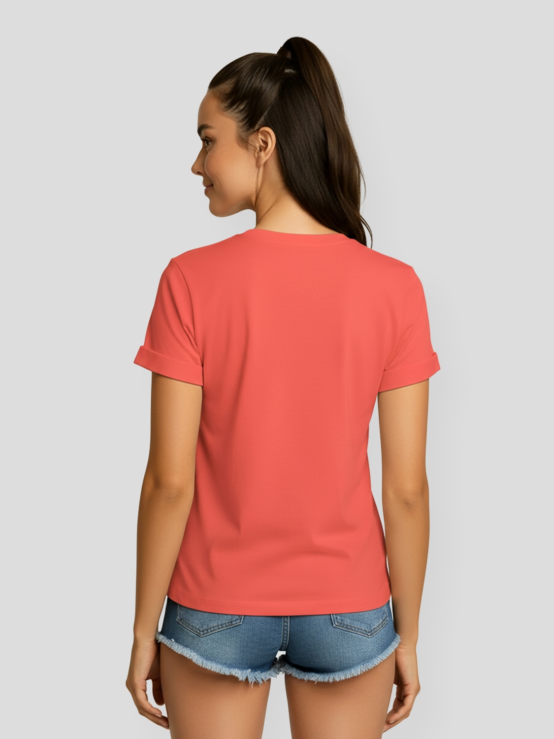 Базовая женская футболка с отворотами на рукавах, цвет коралловый. Сшита из высококачественного хлопкового материала качества Пенье. Футболка сохраняет свою форму даже после многократных стирок, на материала не образовываются катышки. Крой прямой, свободный. О-образный вырез горловины, сама горловина выполнена из основного материала футболки.