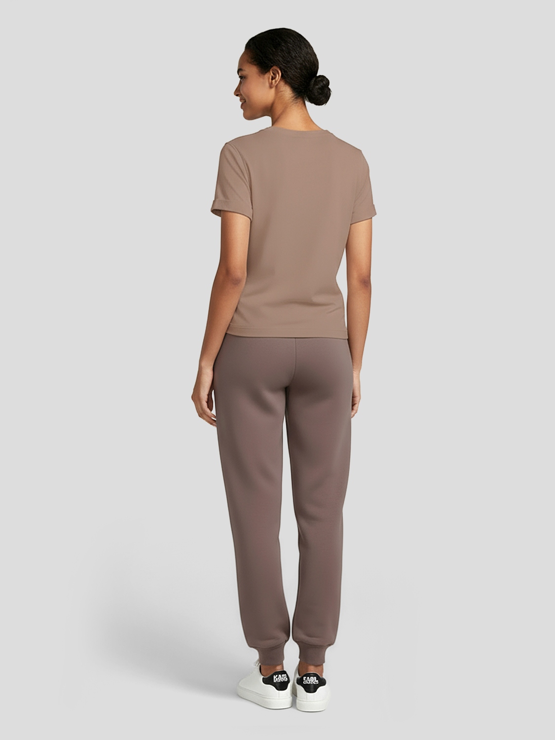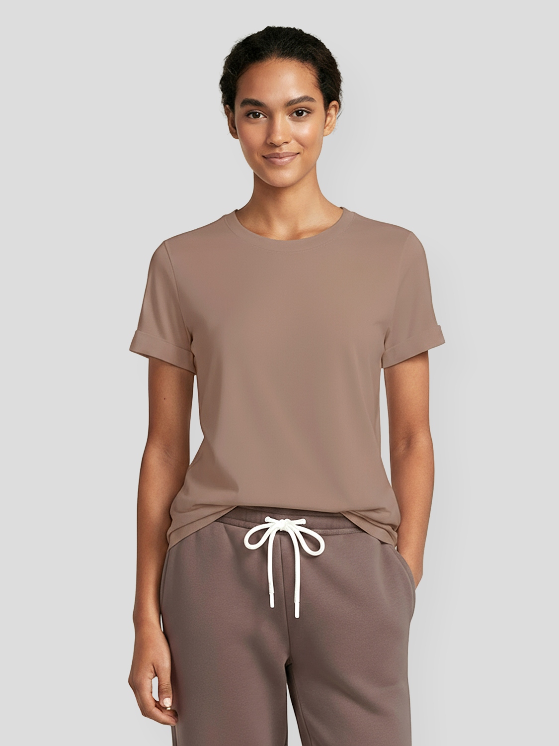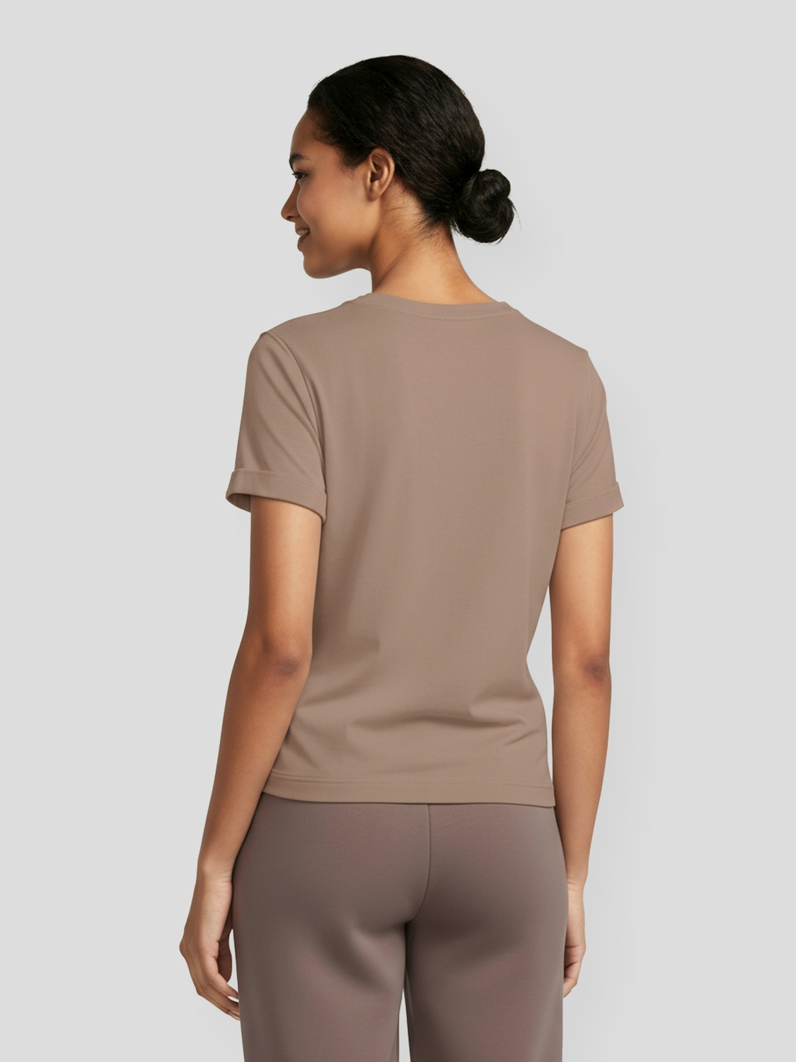 Базовая женская футболка с отворотами на рукавах, цвет какао. Сшита из высококачественного хлопкового материала качества Пенье. Футболка сохраняет свою форму даже после многократных стирок, на материала не образовываются катышки. Крой прямой, свободный. О-образный вырез горловины, сама горловина выполнена из основного материала футболки.