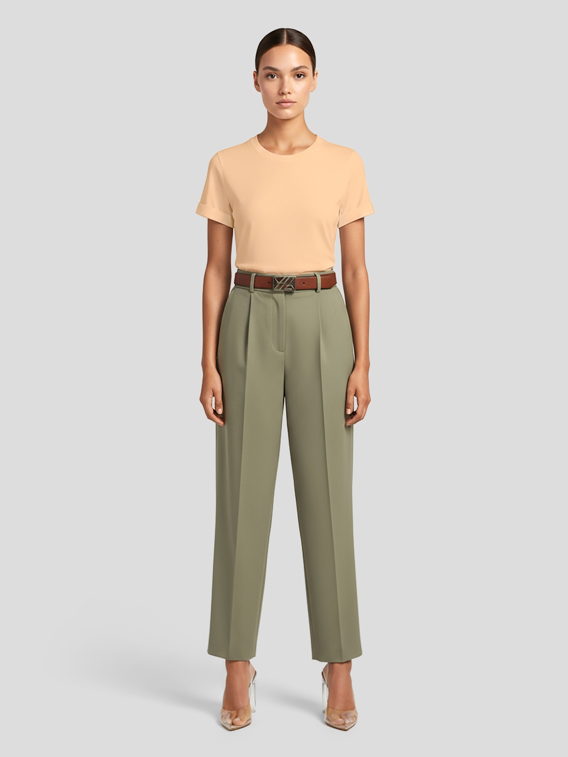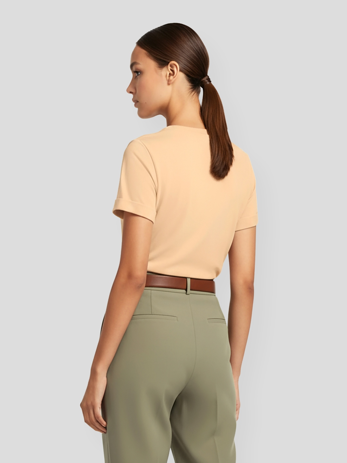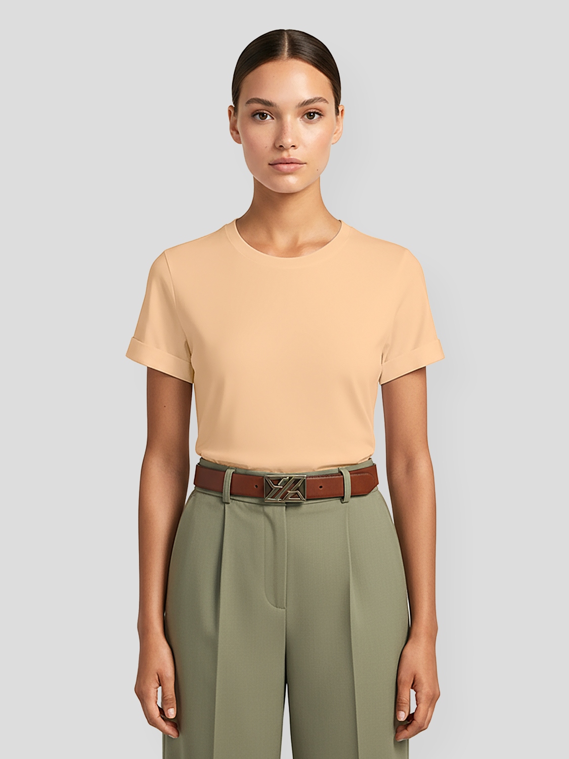 Базовая женская футболка с отворотами на рукавах, цвет бежевый. Сшита из высококачественного хлопкового материала качества Пенье. Футболка сохраняет свою форму даже после многократных стирок, на материала не образовываются катышки. Крой прямой, свободный. О-образный вырез горловины, сама горловина выполнена из основного материала футболки.